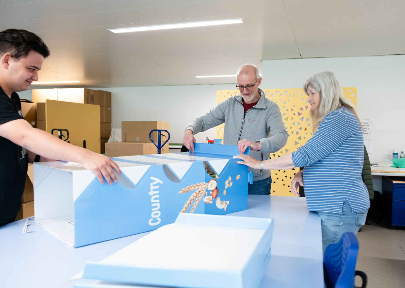Wenn Sie in einer Coop-Filiale zu einem «Country»-Riegel greifen, steckt vielleicht ein Stück ADW-Werkstatt darin. Gemeinsam mit unserer langjährigen Partnerin Bourquin SA durften wir 190 Paletten mit insgesamt 760 Verkaufsdisplays produzieren.